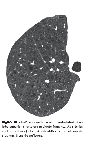 Enfisema centroacinarDestruição das paredes dos alvéolos centroacinares, associada ao aumento dos bronquíolos respiratórios e dos alvéolos que se originam nesses bronquíolos. É a forma mais comum de enfisema em fumantes de cigarro. Os achados tomográficos são de áreas centrolobulares de diminuição da atenuação, usualmente sem paredes visíveis, com distribuição não uniforme, predominantemente localizadas nas regiões pulmonares superiores (Figura 18).(37,38) As artérias centrolobulares podem frequentemente ser identificadas no interior das áreas hipodensas. O termo centrolobular é comumente utilizado como sinônimo na TC.