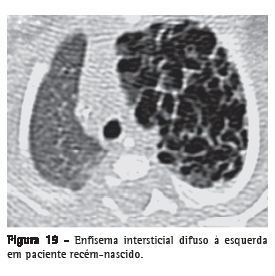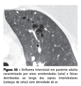 Enfisema intersticialDissecção do interstício pulmonar por ar, tipicamente localizado nos feixes broncovasculares, nos septos interlobulares e na pleura visceral, sendo mais frequentemente identificado em neonatos submetidos à ventilação mecânica (Figura 19). O enfisema intersticial dificilmente é reconhecido radiologicamente em adultos e é raramente identificado nos exames de TC. O processo expressa-se como áreas com densidade de ar com distribuição perivascular, peribroncovascular e/ou ao longo dos septos interlobulares (Figura 20), ou como áreas arredondadas de baixa atenuação simulando pequenas bolhas ou cistos (Figuras 19 e 20).(40,41)