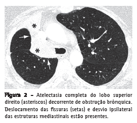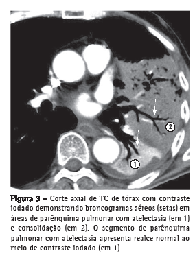 AtelectasiaRedução volumétrica do pulmão decorrente de uma menor aeração de uma parte ou de todo o pulmão.(11) Manifesta-se como um aumento da atenuação do parênquima pulmonar associado à redução de volume, caracterizado pelo deslocamento das fissuras, das estruturas mediastinais ou do diafragma e pela aproximação das estruturas broncovasculares do parênquima envolvido (Figuras 2 e 3).(3,12) A distribuição pode ser subsegmentar, segmentar, lobar ou envolver todo um pulmão. Pode também ser qualificada, segundo a forma, como laminar (discoide) ou redonda.(13) Nos estudos com contraste iodado, o realce homogêneo do parênquima pulmonar pode ajudar na diferenciação com consolidação (Figura 3). O termo "colapso" pode ser utilizado na presença de atelectasia completa de um lobo ou de todo o pulmão.