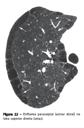 Enfisema pulmonarAumento permanente do espaço aéreo distal ao bronquíolo terminal, com destruição das paredes alveolares.(35) O critério histológico adicional de "ausência de fibrose óbvia" tem sido questionado porque algum grau de fibrose intersticial pode estar presente em consequência do tabagismo.(36) O enfisema é classificado de acordo com a região do ácino acometida: proximal (enfisema centroacinar ou centrolobular), distal (enfisema parasseptal), ou todo o ácino (enfisema panacinar ou panlobular).(37) Os achados tomográficos são de áreas de baixa atenuação, tipicamente sem paredes visíveis.(37,38)