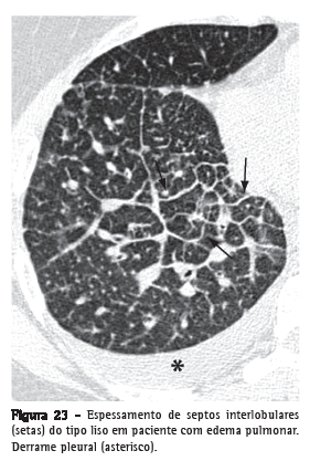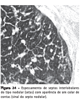 Usualmente encontra-se em íntimo contato com a superfície pleural lateral, junto aos seios costofrênicos, apresentando um ângulo reto em relação à parede. Atualmente os termos "linhas septais" ou "espessamento septal" têm sido preferidos ao invés de linhas de Kerley. Na TCAR (Figura 23), o espessamento dos septos interlobulares é caracterizado pela presença de opacidades lineares que delimitam os lóbulos pulmonares secundários, mais facilmente caracterizável na região subpleural, onde tem aspecto de linhas perpendiculares à superfície pleural.(3,44) Nas regiões centrais dos pulmões, o espessamento dos septos de lóbulos adjacentes resulta no aspecto de arcadas poligonais. O espessamento septal pode ser secundário à alteração de qualquer um de seus componentes (veias, vasos linfáticos ou tecido conectivo) e é um achado comum a várias alterações pulmonares, embora sua presença seja particularmente destacada nos casos de edema pulmonar e de linfangite carcinomatosa. O espessamento septal pode ser do tipo liso (Figura 23), nodular (Figura 24) ou irregular. Essa diferenciação pode ajudar no diagnóstico diferencial das diversas etiologias.