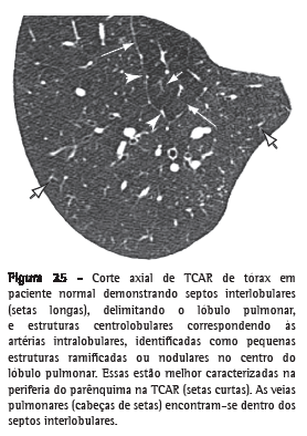 Lóbulo pulmonar secundárioMenor unidade anatômica pulmonar delimitada por septo de tecido conjuntivo. Apresenta aspecto poliédrico, mede 1,0-2,5 cm de diâmetro e contém um número variado de ácinos.(45) O centro do lóbulo é formado pelo conjunto bronquíolo-artéria pulmonar, vasos linfáticos e interstício adjacente. Em sua periferia, o tecido conjuntivo forma septos finos denominados de septos interlobulares, onde se encontram pequenas veias pulmonares e vasos linfáticos (Figura 25). Os septos interlobulares em pacientes normais são identificados, de forma melhor, nas regiões periféricas anterior, lateral e justamediastinal dos lobos superiores e médio, assim como na periferia da região diafragmática anterior dos lobos inferiores, tendendo a apresentar-se de forma incompleta ou ausente nas demais regiões do pulmão. São facilmente reconhecíveis na TCAR sempre que o interstício septal estiver comprometido (Figuras 23 e 24).(3)