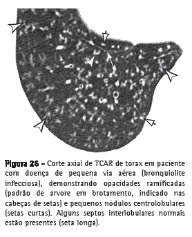 Padrão de árvore em brotamentoOpacidades ramificadas centrolobulares, com pequenas nodulações nas extremidades, assemelhando-se ao aspecto do brotamento de algumas árvores (Figura 26).(3,45) Representam, na maior parte dos casos, bronquíolos dilatados e preenchidos por material patológico, embora possa também estar relacionado com a infiltração do tecido conjuntivo peribroncovascular centrolobular ou, ocasionalmente, com a dilatação ou o preenchimento (por ex.: metástases intravasculares) das artérias pulmonares centrolobulares.(60,61) Significa, em geral, doença das vias aéreas, sendo particularmente comum em processos infecciosos (por ex.: tuberculose, broncopneumonia e bronquiolite infecciosa), mas pode ser encontrado também numa série de outras afecções (por ex.: bronquiectasias, fibrose cística e panbronquiolite).(47)