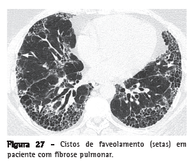 Faveolamento (favo de mel)Cistos pulmonares criados pela destruição de espaços aéreos distais, por fibrose do parênquima pulmonar, com desarranjo da arquitetura de ácinos e bronquíolos. Os cistos de faveolamento são revestidos por epitélio bronquiolar metaplásico e representam o estágio terminal de várias doenças pulmonares.(1,48) Na TCAR, caracteriza-se por múltiplos cistos, em geral de localização subpleural, com diâmetros semelhantes (tipicamente de 0,3-1 cm), agrupados em camadas e compartilhando