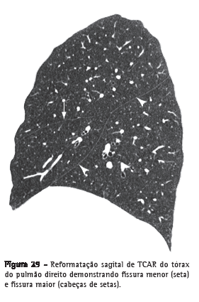 Fissura (cissura)Invaginação da pleura visceral que reveste a superfície externa do pulmão para dentro do parênquima.(7) Cada fissura interlobar é formada pela aposição de duas camadas de pleura visceral. Em geral, identificam-se as fissuras maiores (oblíquas), que separam os lobos inferiores dos demais, e a fissura menor (horizontal), que separa o lobo médio do lobo superior direito (Figura 29). Algumas fissuras supranumerárias podem ser encontradas com frequência.