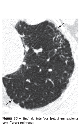 InterfaceSuperfície de separação entre duas estruturas ou espaços. Quando duas estruturas torácicas com diferentes densidades radiológicas se encontram, seus limites são nítidos. Por exemplo, vasos com densidade de partes moles em contato com a densidade de ar do pulmão arejado circunjacente. O "sinal da interface" define a irregularidade das margens entre diferentes estruturas intratorácicas, tais como vasos, brônquios e superfícies pleurais, em geral em decorrência de doença intersticial que causa fibrose (Figura 30).(3)