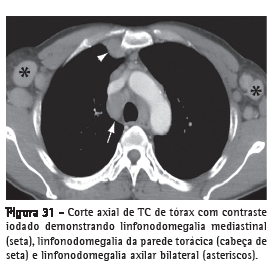 LinfonodomegaliaAumento de volume de linfonodo de qualquer etiologia, quando suas dimensões ultrapassam os limites considerados normais para a cadeia linfonodal em questão (Figura 31).(52,53) O termo "adenomegalia" não é um sinônimo recomendável, pois linfonodos não são estruturas glandulares verdadeiras. O termo "linfonodopatia" reserva-se para situações onde for possível identificar a doença linfonodal, como, por exemplo, quando se identifica necrose em seu interior.