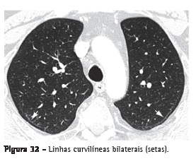 Linha curvilínea subpleuralOpacidade curvilínea de 1-3 mm de espessura, de localização subpleural, com distribuição paralela a sua superfície (Figura 32). É um indicador não específico de atelectasia, edema, fibrose ou inflamação.(3,7)