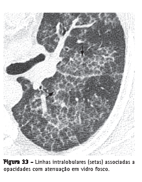 Linhas intralobularesCaracterizadas na TCAR como imagens lineares finas no interior do lóbulo pulmonar secundário e, quando acentuadas, resultam em um aspecto rendilhado fino (Figura 33). Este achado pode ser encontrado em diversas situações, destacando-se as doenças fibrosantes (por ex.: pneumonia intersticial usual) e aquelas associadas ao padrão de pavimentação em mosaico (por ex.: proteinose alveolar).(3,54)