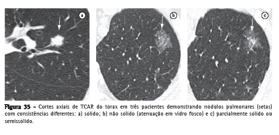 NóduloOpacidade focal arredondada, ou pelo menos parcialmente delimitada, menor que 3,0 cm de diâmetro, geralmente com densidade de partes moles ou de cálcio (Figura 35). Quando menor que 10 mm, sugere-se qualificá-lo como "pequeno nódulo". Se menor que 3 mm, o termo "micronódulo" pode ser empregado.(3,7) Deve ser descrito de acordo com as características de suas margens (mal definidas ou bem definidas), e também quanto à localização e distribuição (randômica, perilinfática, centrolobular ou pleural). Quanto à atenuação, o nódulo pode ser classificado como sólido (Figura 35a), quando obscurece completamente o parênquima; não sólido (atenuação em vidro fosco) quando não obscurece as margens vasculares e paredes brônquicas (Figura 35b); ou parcialmente sólido ou semissólido (opacidade em vidro fosco com áreas sólidas), quando obscurece parcialmente as margens vasculares e as paredes brônquicas (Figura 35c).(7) Ver também Massa.