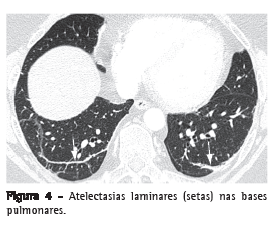 Atelectasia laminarÁrea focal de atelectasia subsegmentar com configuração linear ou discoide, quase sempre se estendendo até a pleura (Figura 4). Geralmente horizontal ou oblíqua, mas pode também ser orientada verticalmente. A espessura pode variar de alguns milímetros a mais de 1 cm.(14) Sinônimo: atelectasia discoide.