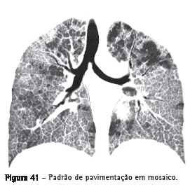 Padrão de pavimentação em mosaicoSuperposição de opacidades em vidro fosco, linhas intralobulares e espessamento de septos interlobulares (Figura 41). A interface entre o pulmão normal e o acometido tende a ser bem delimitada nesse padrão de lesão pulmonar. Esse padrão foi inicialmente identificado em pacientes com proteinose alveolar pulmonar mas também é encontrado em outras doenças pulmonares difusas nas quais os compartimentos intersticial e alveolar estão comprometidos (por ex.: hemorragia pulmonar). O termo em inglês é "crazy paving".(1,2,64)