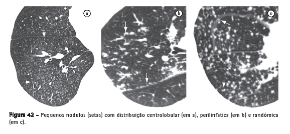 Padrão nodular perilinfáticoPadrão de distribuição de pequenos nódulos ao longo da rede linfática pulmonar (septos interlobulares, bainha conjuntiva peribroncovascular e superfície pleural) (Figura 42b). As principais doenças que cursam com nódulos perilinfáticos são a sarcoidose e a linfangite carcinomatosa.(45,65)