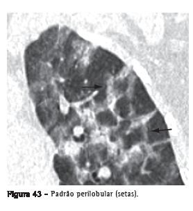 Padrão perilobularEste padrão é caracterizado pela distribuição da anormalidade ao longo das estruturas que delimitam os lóbulos pulmonares, ou seja, os septos interlobulares, a pleura visceral e grandes vasos pulmonares.(66) O termo é mais frequentemente utilizado no contexto de doenças (por ex.: pneumonia em organização perilobular) que são distribuídas principalmente em volta da periferia do lóbulo secundário. Na TC, é caracterizado pela presença de opacidades poligonais espessas e irregulares na periferia do lóbulo pulmonar secundário (Figura 43).(67) Deve ser distinguido do espessamento de septos interlobulares (padrão septal), por ser mais espesso e irregular; e do sinal do halo invertido.