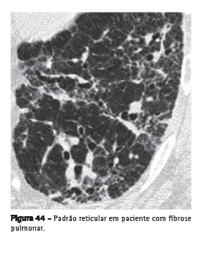Padrão reticularAlteração, usualmente relacionada às doenças intersticiais, caracterizada nas radiografias por inúmeras pequenas opacidades lineares que resultam em uma aparência de rede.(1) Na TCAR, é possível individualizar os componentes responsáveis por esse padrão na radiografia, que usualmente estão relacionados à presença de linhas intralobulares e septais (Figura 44) ou à presença de cistos cujas paredes se apresentam como linhas na radiografia, como nas doenças císticas pulmonares, no enfisema associado a bolhas e até mesmo nos cistos de faveolamento.(1,3,7)