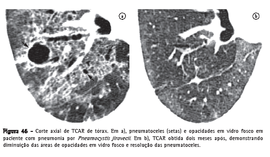 Espaço de conteúdo gasoso cuja parede é formada por espaços aéreos distendidos. Frequentemente muda de tamanho em curto espaço de tempo, decorrente do mecanismo valvular obstrutivo da via aérea, que lhe é característico.(71) Costuma associar-se a algumas enfermidades infecciosas, sobretudo aquelas causadas por Staphylococcus sp. em crianças e Pneumocystis sp. em adultos. Na TC, manifesta-se como espaço aéreo arredondado, demarcado por paredes finas, contido no pulmão (Figura 46a).(3,7) Pode resolver de forma espontânea, ainda que
