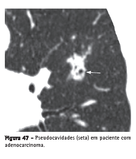 Representa uma área arredondada ou oval de baixo coeficiente de atenuação em nódulos ou massas pulmonares ou em uma área de consolidação secundária a: 1) presença de uma porção de parênquima pulmonar preservado; 2) presença de brônquios dilatados ou mesmo de calibre normal; ou 3) uma área de enfisema no interior da lesão (Figura 47). Estas pseudocavidades geralmente medem menos de 1 cm de diâmetro. Podem ser identificadas em pacientes com adenocarcinoma, carcinoma bronquioloalveolar e pneumonia.(7,72)