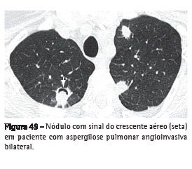 Bola fúngicaResulta da colonização fúngica de cavidades pulmonares preexistentes, geralmente secundárias à tuberculose ou à sarcoidose, mas pode também ocorrer dentro de cistos (por ex.: cisto broncogênico), bolhas e brônquios dilatados. Na maioria das vezes, a colonização é causada por Aspergillus spp., sendo comum, nesse caso, o uso do termo "aspergiloma". Representa um enovelado de hifas associado a muco, fibrina e restos celulares. Na TC, apresenta-se como uma imagem de uma massa, arredondada ou oval, com tendência a mover-se para uma localização pendente com a aquisição de imagens em decúbitos diferentes (Figura 7).(19) Outros achados comuns da bola fúngica incluem a presença do "sinal do crescente aéreo", calcificação amorfa no interior da lesão, aspecto espongiforme da lesão e espessamento pleural adjacente. O termo "bola fúngica" não deve ser utilizado como sinônimo de "micetoma", por representarem processos diferentes.(20)