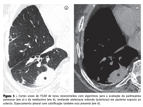 Atelectasia redondaAtelectasia de forma arredondada ou oval que decorre de aderência do parênquima pulmonar adjacente à área de espessamento pleural, como ocorre, por exemplo, na doença pleural relacionada ao asbesto ou na resolução de empiema.(15) Manifesta-se como uma opacidade focal arredondada para a qual convergem estruturas broncovasculares (sinal da cauda de cometa) com base pleural junto à área de espessamento da pleura (Figura 5).(16,17) Apresenta realce homogêneo ao contraste iodado endovenoso.
