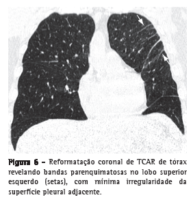 Banda parenquimatosaOpacidade linear, geralmente periférica, na maioria das vezes em contato com a superfície pleural, que pode estar espessada e retraída no local de contato (Figura 6). Usualmente tem espessura de 1-3 mm e se estende por menos de 5 cm.(3) Costuma ter distribuição horizontal (perpendicular à superfície pleural), mas pode ser oblíqua. Geralmente traduz fibrose pleuroparenquimatosa. Distorções da arquitetura pulmonar costumam ser identificadas. Bandas parenquimatosas são mais frequentemente encontradas em pacientes expostos ao asbesto.(18)
