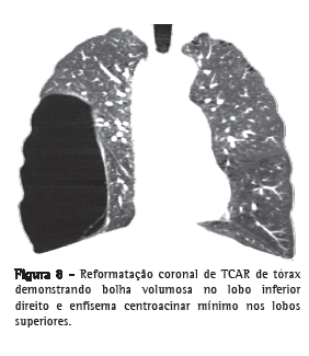 BolhaÁrea focal hipodensa que apresenta paredes bem definidas e lisas que não ultrapassam 1 mm de espessura (Figura 8).(4) Geralmente de conteúdo gasoso, mas pode ocasionalmente ter nível líquido. Em geral, associa-se a outros sinais de enfisema pulmonar e apresenta localização parasseptal (achados que auxiliam na diferenciação de cistos na TC). Tipicamente mede 1 cm ou mais de diâmetro. Bolhas menores que 1 cm, localizadas na pleura visceral ou na região pulmonar subpleural, são denominadas de blebs na língua inglesa.(3,7) As blebs (tentativamente traduzidas como vesículas) de localização apical são frequentemente responsáveis pelo pneumotórax espontâneo primário. O termo em inglês de bolha é bulla.