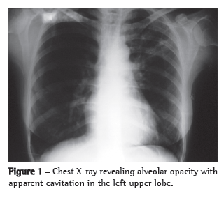 Another TST was performed, and the result was again negative (induration, 0 mm). Two consecutive sputum samples were smear-negative (Ziehl-Neelsen staining). The patient underwent bronchoscopy, which showed a whitish infiltrative lesion occluding 50% of the bronchial lumen of the left upper lobe as well as intense adjacent inflammatory reaction. The anatomopathological examination of the bronchial lesion revealed an extensive, chronic granulomatous inflammatory response with coagulative necrosis. There were no signs of malignancy. The bronchoalveolar lavage fluid tested positive for AFB in smear microscopy. The patient was diagnosed with pulmonary tuberculosis, and treatment with regimen I (rifampin/isoniazid/pyrazinamide) was instituted. She presented favorable evolution, showing improvement in the symptoms and in the radiological aspect thirty days later. The patient was discharged after six months of treatment, showing complete resolution of the respiratory symptoms and significant improvement in the chest X-ray results (Figure 4).