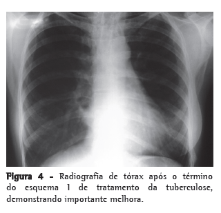 Uma nova PT foi realizada e continuou não reatora (0 mm). A baciloscopia de escarro (coloração de Ziehl-Neelsen) foi negativa em duas amostras consecutivas. Foi submetida à broncoscopia, que demonstrou lesão infiltrativa esbranquiçada ocluindo 50% da luz do brônquio do lobo superior esquerdo com intensa reação inflamatória adjacente. O exame anatomopatológico da lesão brônquica revelou extensa reação inflamatória crônica granulomatosa com necrose coagulativa. Ausência de sinais de malignidade. A pesquisa de BAAR foi positiva no lavado broncoalveolar. Recebeu o diagnóstico de tuberculose pulmonar, e instituiu-se tratamento com esquema I(rifampicina/isoniazida/pirazinamida). A paciente evoluiu bem, com melhora dos sintomas e do aspecto radiológico após 30 dias. Recebeu alta após seis meses de tratamento, com resolução total dos sintomas respiratórios e importante melhora da radiografia de tórax (Figura 4).