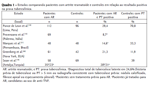 Com exceção do estudo realizado em Nova York, os outros estudos descritos mostram uma significativa menor porcentagem de pacientes com AR e resultado positivo para PT (mesmo considerando-se como resultado positivo PT ≥ 5 mm) do que entre controles saudáveis, sugerindo, então, uma menor habilidade da PT em identificar tuberculose latente nesse grupo de pacientes (Quadro 1).