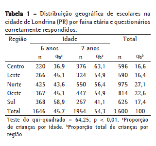 Obedecendo a distribuição proporcional de crianças entre 6 e 7 anos de idade por região e o número de escolas públicas na cidade de Londrina, foram enviados 3.963 questionários. Destes, 3.600 (90,8%) estavam completamente preenchidos, constituindo, dessa forma, o banco de dados. Do total, 45,7% dos escolares tinham 6 anos e 54,3% tinham 7 anos.
