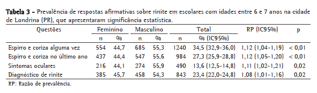 Os pais dos escolares relataram que, no último ano, sintomas nasais sem quadro gripal associado ("rinite ativa") ocorreram em 27,3% das crianças, o diagnóstico médico de rinite foi de 23,4% e sintomas oculares associados ocorreram em 13,6% dos escolares. Esses dados estão apresentados na Tabela 3.