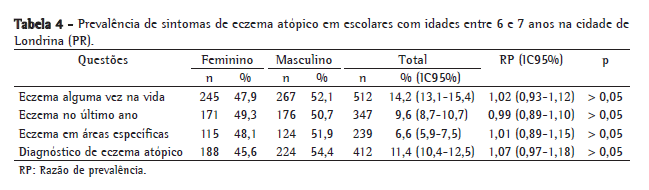 Na Tabela 4, encontra-se a distribuição das respostas afirmativas para as questões do módulo de eczema atópico. O relato de sintomas nos últimos 12 meses ("eczema ativo") foi de 9,6%. O diagnóstico médico encontrado foi de 11,4%. Quanto ao sexo, não houve diferenças significativas nas respostas.