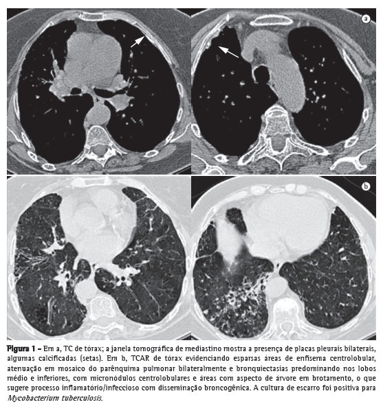 Apresentava à TCAR de tórax áreas de enfisema centrolobular, atenuação em mosaico bilateralmente, bronquiectasias nos lobos superior direito, médio e inferiores, nos quais se notavam ainda micronódulos centrolobulares e áreas com padrão de árvore em brotamento, sugerindo processo inflamatório/infeccioso com disseminação broncogênica. A janela de mediastino mostrava a presença de placas pleurais bilaterais, algumas calcificadas (Figura 1).