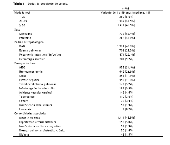 A idade dos pacientes variou de 1 a 99 anos (mediana, 48 anos): 286 (9,6%) entre 1 e 20 anos de idade; 1.333 (43,9%) entre 21 e 49 anos de idade; e 1.411 (46,5%) com 50 anos ou mais. Dentre as autopsias incluídas na amostra, 1.772 (58,4%)