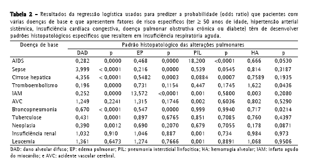 A Tabela 2 mostra os resultados da regressão logística usados para predizer a probabilidade que pacientes com certos fatores de risco associados e doenças de base têm de desenvolver padrões histopatológicos específicos de IRA. Encontramos alta probabilidade de desenvolver padrão histopatológico de PIL em pacientes com aqueles fatores de risco e AIDS (OR = 18,20; p < 0,0001). Pacientes com 50 anos de idade ou mais, com hipertensão arterial sistêmica, insuficiência cardíaca congestiva, doença pulmonar obstrutiva crônica ou diabete apresentaram maior probabilidade de desenvolver o padrão histopatológico de DAD se também tivessem sepse (OR = 3,99; p < 0,0001) ou cirrose hepática (OR = 4,35; p < 0,0001). Esses fatores de risco associados e tromboembolismo pulmonar correlacionaram-se significativamente com o risco de desenvolver hemorragia alveolar (OR = 1,62; p = 0,04). Encontrou-se probabilidade significativa de desenvolver edema pulmonar como padrão histopatológico específico em pacientes com os mesmos fatores de risco concomitantes com IAM (OR = 13,57; p < 0,0001). Pacientes que apresentaram acidente vascular cerebral, broncopneumonia, tuberculose, neoplasia, insuficiência renal crônica e leucemia apresentaram proteção conseqüente, bem como a chance, embora menor, de desenvolver qualquer dos padrões histopatológicos específicos: DAD, edema pulmonar, PIL e hemorragia alveolar.