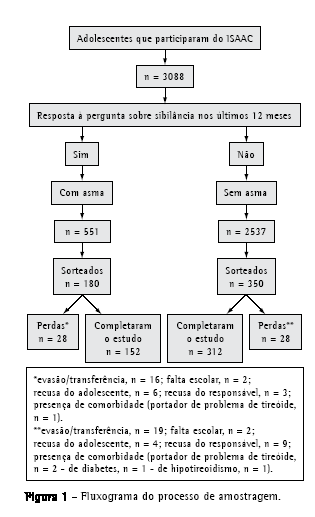 A população estudada compreendeu adolescentes estudantes de escolas públicas que haviam participado do inquérito epidemiológico sobre prevalência de asma (ISAAC) realizado em Belo Horizonte em 2002. Um total de 3.088 estudantes de 14 escolas municipais, selecionadas aleatoriamente, participaram do ISAAC (Figura 1). Eles foram divididos em dois grupos: com asma (n = 551) e sem asma (n = 2.537). Foi determinado como critério de exclusão a existência de comorbidades clínicas que pudessem interferir na interpretação dos resultados.