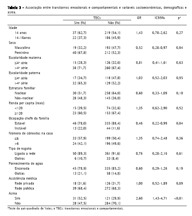 Na Tabela 3 são apresentados os resultados da análise univariada da associação entre TECs e variáveis demográficas e asma. Os TECs foram mais freqüentes em adolescentes com asma (p < 0,01), no sexo feminino (p = 0,04) e naqueles cujo chefe de família tinha uma ocupação instável (p = 0,04).