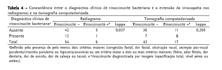 Conforme mostra a Tabela 4, não houve concordância entre o diagnóstico clínico de rinossinusite bacteriana e o grau de anormalidades observado nos radiogramas de seios paranasais (kappa = 0,037) ou na TC de seios paranasais (kappa = 0,205). Dos 17 pacientes com nível líquido ou opacificação total na TC, 11 (6 do grupo com asma estável e 5 do grupo com asma aguda) não receberam diagnóstico clínico de rinossinusite bacteriana.