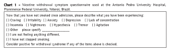 Patients who were smokers were asked to provide additional information: amount of cigarette consumption; age at smoking initiation and duration of smoking; degree of interest in quitting smoking; number of previous attempts to quit smoking; need for assistance in quitting smoking; level of nicotine dependence; presence of respiratory symptoms, such as dyspnea, cough (dry or productive), and wheezing; family history of smoking; and consumption of alcoholic beverages. In addition, the nicotine withdrawal symptom questionnaire used at the HUAP smoking outpatient clinic was completed (Chart 1).