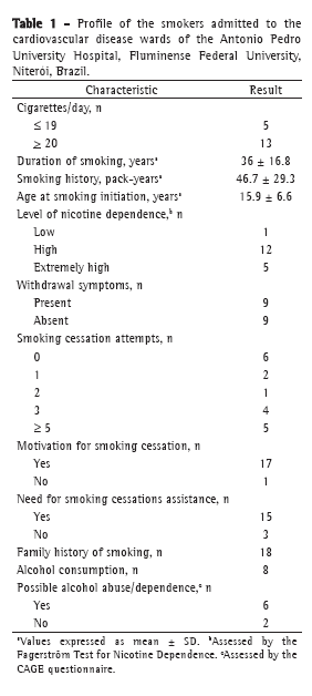 This was a prospective study involving 136 inpatients treated between May of 2008 and April of 2009 on the cardiovascular disease wards at the Fluminense Federal University Hospital Universitário Antonio Pedro (HUAP, Antonio Pedro University Hospital), located in the city of Niterói, Brazil. The HUAP is a tertiary-care facility that provides medical care to patients residing in an area known as Metropolitan Area II, which comprises the cities of Niterói, São Gonçalo, Itaboraí, Rio Bonito, Maricá, Tanguá, and Silva Jardim, with an estimated population of 1,900,000 inhabitants. The hospital, with 283 inpatient beds and 30 clinical and surgical specialties, primarily receives cases of high complexity, admitting approximately 500 patients per month (6,000 admissions per year). In compliance with the Framework Convention on Tobacco Control and Federal Law no. 9294, issued on July 15, 1996, which prohibits smoking in health care facilities, the HUAP has been a smoke-free facility since January of 2005.