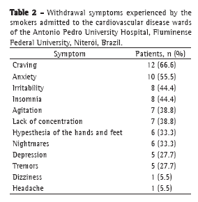 In Brazil, there have been few studies of in-hospital smoking cessation treatment and management. In the present study, the prevalence of current smoking was found to be 13.2% among the 136 inpatients evaluated. Of those, 88.2% had concomitant withdrawal symptoms. In a study of 650 hospitalized smokers conducted at a hospital in the United States, the prevalence of active smoking was found to be 25%, and 55% of the patients who were smokers reported withdrawal symptoms.(8) The incidence of smoking among hospitalized patients in smoke-free psychiatric hospitals is nearly 50%.(15) Emmons & Goldstein(16) found that the prevalence of smoking in 304 inpatients treated on a cardiovascular disease ward was 16%. In a study of 110 inpatients conducted at the São Paulo Hospital for State Civil Servants, located in the city of São Paulo, Brazil, the prevalence of smoking was found to be 17%, and 15% of the patients who were smokers reported withdrawal symptoms.(9) Another group of authors(17) found that smokers hospitalized for elective surgery had no severe withdrawal symptoms, suggesting that the psychological stress caused by the surgical procedure might have lessened the withdrawal symptoms.