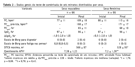 Todos os participantes toleraram bem os testes, e nenhum teste foi interrompido antes de completar 6 minutos. Foram incluídos na análise final 132 indivíduos, sendo 66 do sexo feminino e 66 do sexo masculino; 113 eram da raça branca, e 19 eram da raça negra. A distribuição por sexo e pelos dados antropométricos é mostrada na Tabela 1.
