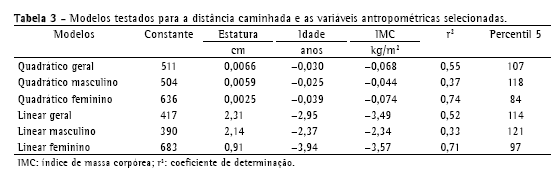 Em relação às variáveis antropométricas, no presente trabalho e em todos os trabalhos com amostras significativas,(13-17,19) a estatura foi uma variável relevante na predição da DTC6. No estudo de Iwama et al.,(18) apenas a idade e o sexo foram considerados na equação de regressão derivada. Entretanto, na análise univariada, a estatura teve o maior coeficiente de correlação, o que implica sua entrada obrigatoriamente na equação multivariada. Em 3 estudos,(14,15,19) o peso também entrou na equação de predição, diferindo do presente estudo, no qual apenas o IMC teve influência significativa, mas não o peso isolado. A idade foi relevante em todos os estudos publicados.