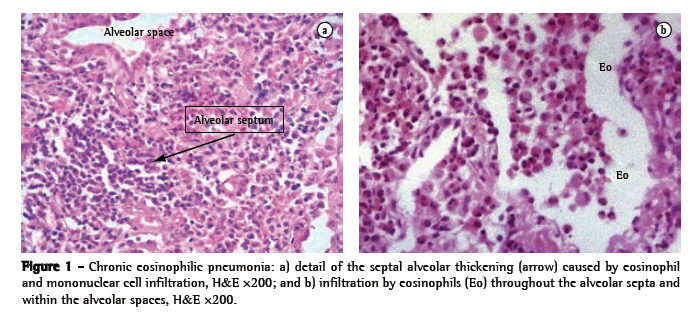 The review of the lung biopsy by a pathologist resulted in a histological diagnosis of chronic eosinophilic pneumonia, possibly attenuated by previous use of steroids, accompanied by alterations resulting from bronchial obstruction. There was infiltration by eosinophils and mononuclear cells throughout the alveolar septa and alveolar spaces (Figure 1).
