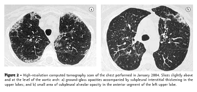A chest X-ray performed four months after the initial medical visit showed areas of subpleural interstitial thickening in the upper lobes. An HRCT scan, performed concomitantly, revealed focal subpleural thickening of the intralobular and interlobular interstitium accompanied by faint ground-glass opacities, these alterations being present only in the upper lobes, and alveolar opacity being observed in the anterior segment of the left upper lobe (Figure 2). There were no mediastinal alterations. A control HRCT scan performed four months later showed no significant changes, except for an improvement in the area of alveolar opacity in the left upper lobe (Figure 3).