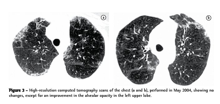 Dyspnea and rales progressively resolved over the course of the treatment, and the dose of oral corticosteroid was progressively reduced until the medication was completely discontinued, after fifteen months of treatment. After the corticosteroid therapy had been discontinued, there was no recurrence of symptoms.
