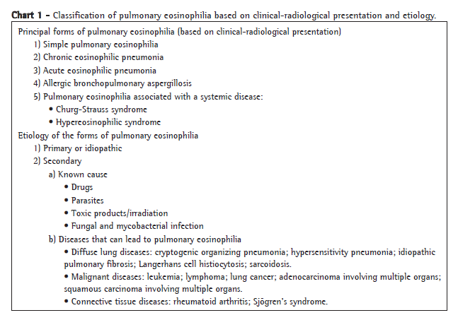 Chart 1 classifies pulmonary eosinophilia in terms of presentation (clinical or radiological) and etiology.(1,12-14) The main clinical and radiological presentations are the following: simple pulmonary eosinophilia; CEP; AEP; ABPA; and pulmonary eosinophilia associated with a systemic disease, such as CSS and hypereosinophilic syndrome (HES). The etiology of pulmonary eosinophilia can be either primary (idiopathic) or secondary, due to known causes, such as drugs, parasites, fungal infection, mycobacterial infection,(15) irradiation and toxic products.