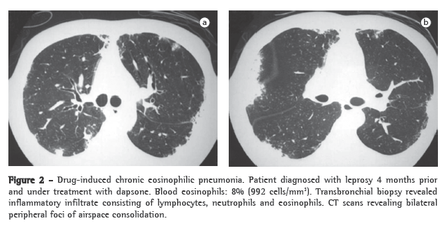 Drug exposure is currently a major cause of pulmonary eosinophilia.(6-8) A long list of drugs that cause pulmonary infiltrates with eosinophilia is available on "The Drug-Induced Lung Diseases" site (www.pneumotox.com).(9) The drugs most frequently mentioned, as of August of 2008, were the following: acetylsalicylic acid; amiodarone; bleomycin; carbamazepine; captopril; phenytoin; hydrochlorothiazide; mesalamine; minocycline; nitrofurantoin; penicillamine; sulfasalazine; and sulfonamide. Iodinated contrast material and blood transfusions are also major sources of exposure.