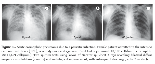 In the past, pulmonary eosinophilia was diagnosed on the basis of clinical findings, radiological (chest X-ray) findings and the presence of eosinophilia in peripheral blood. The use of BAL came to show that there are many cases in which tissue eosinophilia occurs without a concomitant increase in blood eosinophil levels, which expanded the list of diseases.(1) In the peripheral blood, the absolute number of eosinophils is more important in characterizing eosinophilia than is the percentage.
