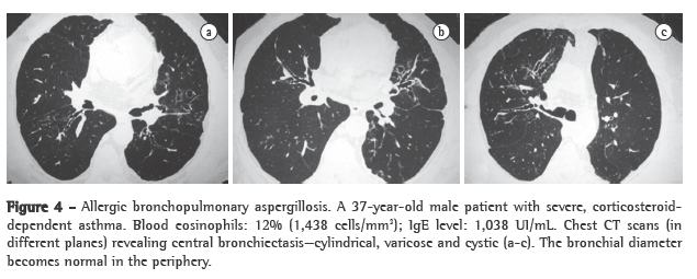 Central bronchiectasis is almost pathognomonic of ABPA, assuming that cystic fibrosis and alpha-1 antitrypsin deficiency have been ruled out. In a study evaluating the CT scans of 17 patients with ABPA and 11 asthma patients with positive skin test reactivity to Aspergillus sp., but with no evidence of ABPA, bronchiectasis was found in 14 of the 17 patients and in only 2 of the 11 patients, respectively.(40) In most cases, the bronchiectasis found in the patients with ABPA was centrally distributed.
