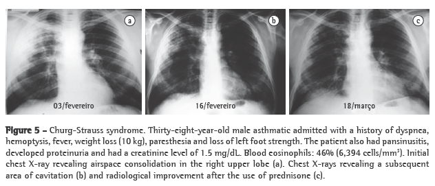 Pulmonary function test results are nonspecific, indicating normal function, mild restrictive defect or obstructive defect. In the retrospective study conducted in France, half of the patients, some of whom did not have asthma, presented or developed obstructive lung disease during the course of the disease or during the follow-up treatment.(22) Hypoxemia or an increased alveolar-arterial oxygen gradient occurs in virtually all patients.